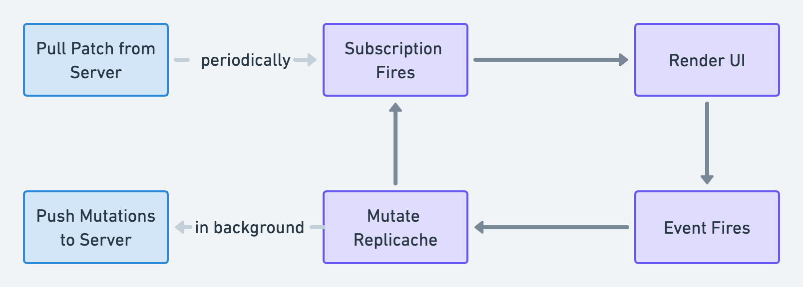 Sync: When a user takes an action in your app, the app invokes a mutator. The mutator modifies the local Replicache, and your subscriptions fire to update your UI. In the background, these changes are pushed to the server in batches, where they are run using the server-side mutators, updating the canonical datastore. When data changes on the server, the server pokes connected Replicaches. In response, Replicache pulls the new state from the server and reveals it to your app. Your subscriptions fire because the data have changed, which updates your app’s UI.